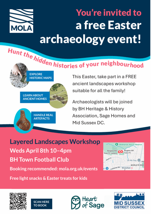 | Details | This Easter you can take part in a free ancient landscapes workshop suitable for all the family. Hunt the hidden histories of your neighbourhood by exploring historic maps, learning about ancient homes and handling real artefacts. Free light snacks and Easter treats for kids. Archaeologists will be joined by members of the Burgess Hill heritage and Historical Association, Sage Homes and Mid Sussex District Council. |