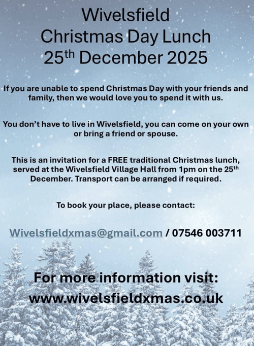 If you are unable to spend Christmas Day with your friends and family, then this could be for you.Join for a warm, festive meal bringing together the community. Everyone is welcome to enjoy food, friendship, and Christmas cheer. The Wivelsfield Community Christmas Lunch is organised by local volunteers and made possible by the generosity of our sponsors and donors. Itβs a chance to celebrate together, share a meal, and spread joy on Christmas Day. You donβt have to live in Wivelsfield, you can come on your own or bring your partner or a friend. * When and where is it happening? This Christmas Day at 12:30 at Wivelsfield Village Hall, Eastern Road RH17 7QH * Who can attend? This lunch is for people who would otherwise be spending Christmas alone or just need to be away from their normal circumstances * How much does it cost? The event is free, it has been paid for by lovely volunteers, sponsors and donors * I have special dietary needs, can I come too? Weβll do our best to look after everybody, let us know when booking * How do I get there, I donβt drive? Where possible we will try and provide transport, however this is completely dependent on volunteer availability. Itβs unlikely that we will be able to provide large or specially modified vehicles. The village hall has ample parking and is well served by local taxi companies * Do I need to book? Yes! Unfortunately we will not be able to accommodate anybody without a free pre-booked ticket Please email wivelsfieldxmas@gmail.com or call 07546003711 * This is a great initiative, how can I support it? You can support us via our JustGiving page