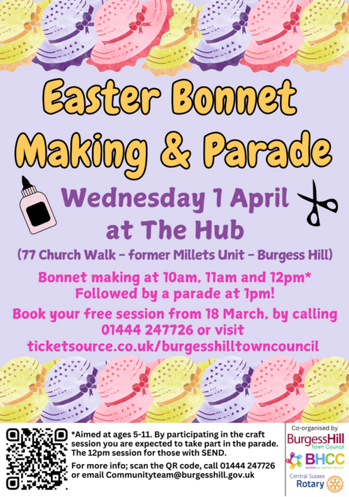 | Details | On Wednesday 1st April, join us and the Burgess Hill Creative Community for Easter bonnet making at the Hub! There will be 3 sessions, followed by photos at the Bandstand and then a short parade, there may even be a special guest attending. Sessions are 45 minutes long and will run at 10am, 11am and 12pm. They are aimed at ages 5-11, with the 12pm session for those with SEND and their siblings. Please note:-By participating in the workshop, you are committed to participating in the parade and must meet at the bandstand at 12.45pm to take part-Families are asked to only book one session-Parents do not require a ticket-Parent/carer interaction is required and children must be accompanied-Burgess Hill residents will be given priority booking-The parade will start at the Bandstand, go down to the Stone Garden, before looping back past the Bandstand and into Market Place Shopping. The parade finishes near Pets at Home For more information call 01444 247726 or email Communityteam@burgesshill.gov.ukThe sessions are co-organised by Burgess Hill Town Council and Burgess Hill Creative Community. |