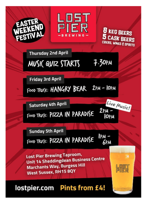 | Details | Lost Pier Brewing are opening up again looking ahead to another successful summer by holding a festival this coming Easter Weekend. On Thursday evening, there will be a music quiz to test your knowledge, starting at 7:30. On Friday, the Hangry Bear foodtruck will be there from 2 in the afternoon until 10pm to compliment the excellent beer with a bit of good food. To go with the drinks and live music Saturday, Pizza in Paradise is the Saturday foodtruck. They will be there from 2pm to 10pm and they are also back on Sunday from 11am to 6pm. At Lost Pier Brewing, they are passionate about beer, believing it is an art form. They will be serving from 8 keg beers and 5 cask beers along with other drinks. Go along and try them out over this Festival. |