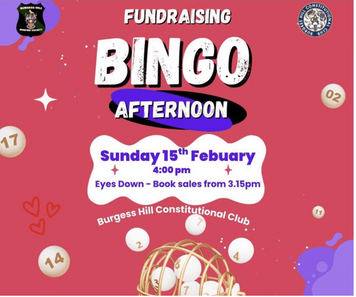 | Details | Fundraising Bingo afternoon at Burgess Hill Constitutional Club with Burgess Hill Bonfire Society. Get your books from 3:15pm and eyes down at 4pm. Adults only. |
