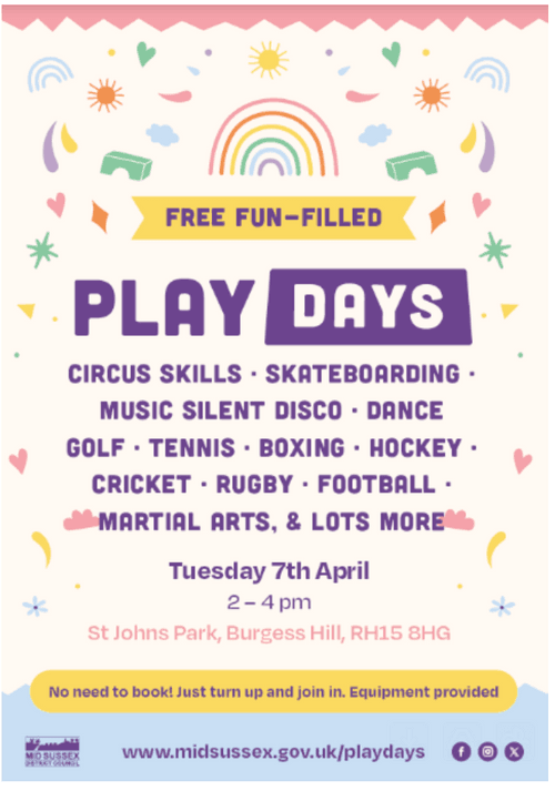 DetailsMid Sussex District Council Play Days will be visiting St John’s Park on Tuesday 7th April from 2 – 4 pm! It is a free event, there’s no need to book and equipment will be provided. This event is about getting families active together and there will be: Tennis, Football, Cricket, Golf, Boxing, Skateboarding, Rugby, Circus Skills, Silent Disco and lots more. Most of the activities are aimed at under 10’s but all ages welcome. For more information visit their website.