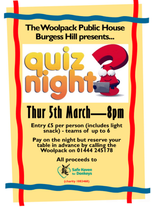 | Details | On Thursday 5th March at 8pm, Safe Haven for Donkeys (charity 1083468) will be holding another of its popular quiz nights at the Woolpack in Howard Avenue, Burgess Hill. Teams of up to 6. Pay on the night but reserve your table in advance by e-mailing wendy@safehaven4donkeys.org or by calling the Woolpack on 01444 245178. All proceeds towards Safe Haven for Donkeys’ work with donkeys in the Middle East. |