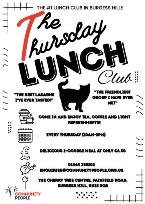 | Details | Every Thursday from 10am to 2pm at The Cherry Tree Centre on Fairfield Road in Burgess Hill, you can enjoy a delicious two course meal for £6.50 with The Thursday Lunch Club. Prepared and served by a dedicated team of volunteers, The Thursday Lunch Club is a long-standing community group that brings people together to meet, socialise and share a meal. Everyone is welcome, and whilst booking isn’t necessary, it’s helpful for the team to know who is coming in advance. If you plan to attend you can contact them directly by calling 01444 258 102 or emailing: enquiries@communitypeople.org.uk |