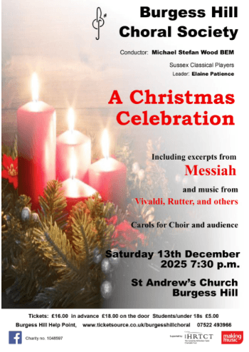 | Details | Join Burgess Hill Choral Society for their Christmas Concert at St Andrew’s Church, including excerpts from Messiah and music from Vivaldi, Rutter, plus others. There will also be Carol singing for the audience. It will be held on Saturday 13 December, from 7.30-9.45pm, with refreshments available during the interval. Tickets are £16 in advance, £18 on door, under-18s £5. They are available from: Burgess Hill Help Point, Jane Leng (Jane.Leng1@outlook.com or 0752 249 3966), via TicketSource or on the door. For more information contact: John Newton 07783 950770 Don’t miss out on their ever-popular Christmas Concert! |