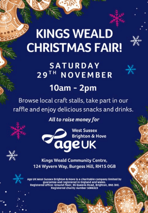 | Details | 🌟Please join us at the Kings Weald Community Centre for a Christmas Fair on Saturday 29th November, from 10am - 2pm. There will be fun for all the family, local craft stalls, a raffle and delicious snacks and drinks. Everyone is welcome 😀 All to raise money for West Sussex / Brighton & Hove Age UK |