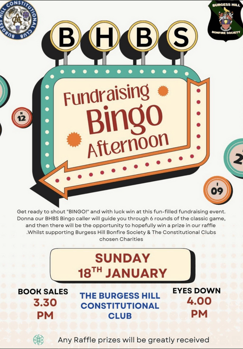 | Details | Get ready to shout 'BINGO!' and with luck win at the next Bingo afternoon at Burgess Hill Constitutional Club on Sunday January 18th, from 3:30pm Donna will guide you through 6 rounds of Bingo, and there will also a raffle. Supporting the chosen charities of the Bonfire Society and The Constitutional Club. |