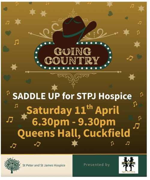 Saddle Up for a Night of Country Fun for a Great Cause Put on your boots and join for a toe‑tapping evening in support of St Peter & St James Hospice at Go Country on Saturday 11th April, from 6.30pm – 9.30pm. Enjoy the fabulous Nashville Night Stage Show, before hitting the dancefloor yourself as you line-dance the night away. Whether you're a seasoned dancer or a complete beginner, everyone is welcome - it's all about having fun all in the name of an incredible local cause. Tickets are £20 per person, and every ticket includes a free welcome drink. So grab your friends, embrace the country vibes, and join them for a lively hoedown. Sign up here: https://buytickets.at/stpeterstjameshospiceinchaileysussex/2035600