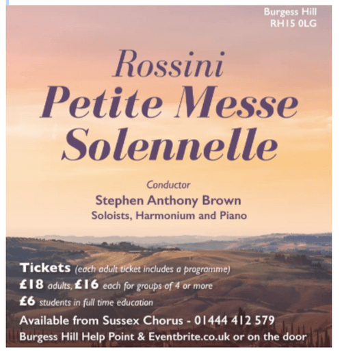 Sussex Chorus will perform Rossini’s 'Petite Messe Solennelle' at St Andrews Church, Burgess Hill on Sa.turday 21st March 2026 - 7:30pm The conductor will be Stephen Anthony Brown and the performance will feature soloists, harmonium and piano. Tickets available below from The Sussex Chorus website, the Burgess Hill Help Point or on the door.